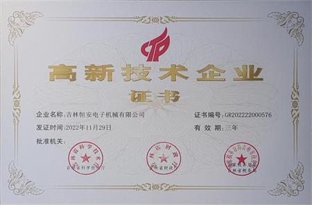 熱烈祝賀:吉林恒安電子機(jī)械有限公司在2022年吉林省科學(xué)技術(shù)廳高新技術(shù)企業(yè)評(píng)定工作中,榮獲高新技術(shù)企業(yè)證書。